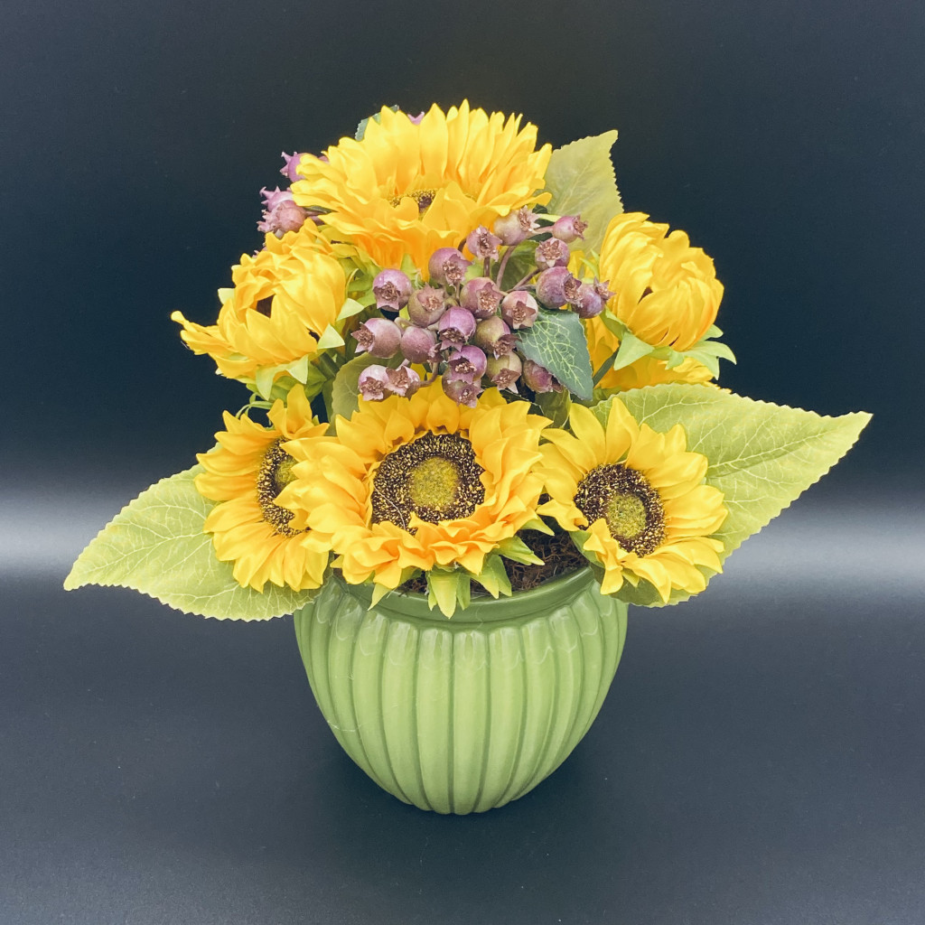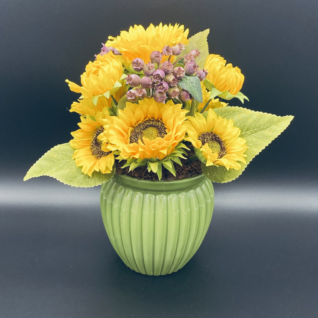 Zöld bordázott kerámia kaspóban, élénk színű napraforgók, lilás bogyós termésekkel díszítve. Nagyan mutatós kis asztaldísz.