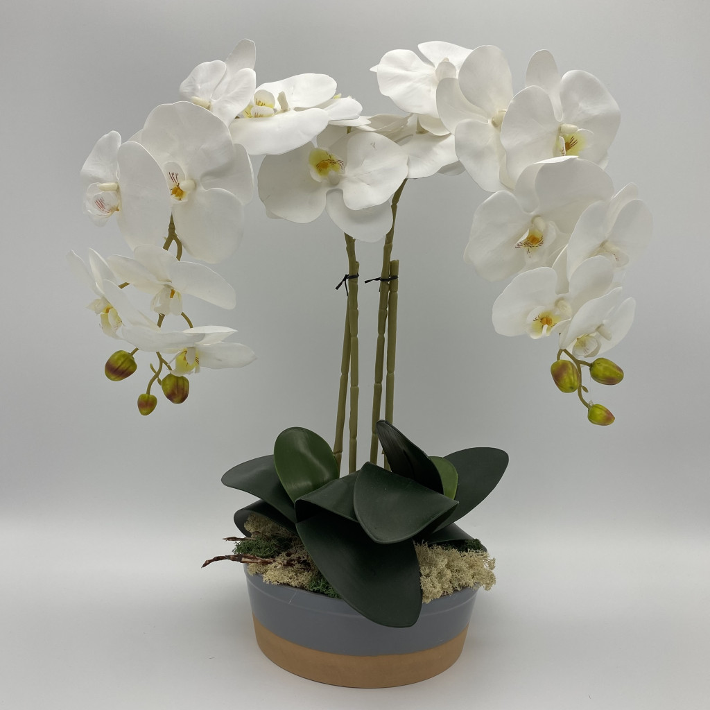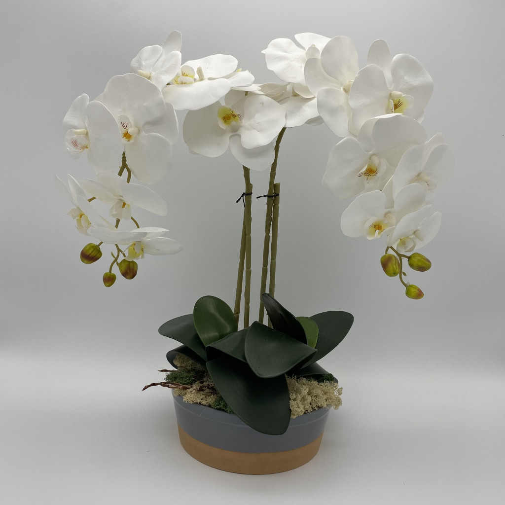 Kétágú fehér színű, Lepkeorchidea, kerámia tálban, izlandi zuzmóval.